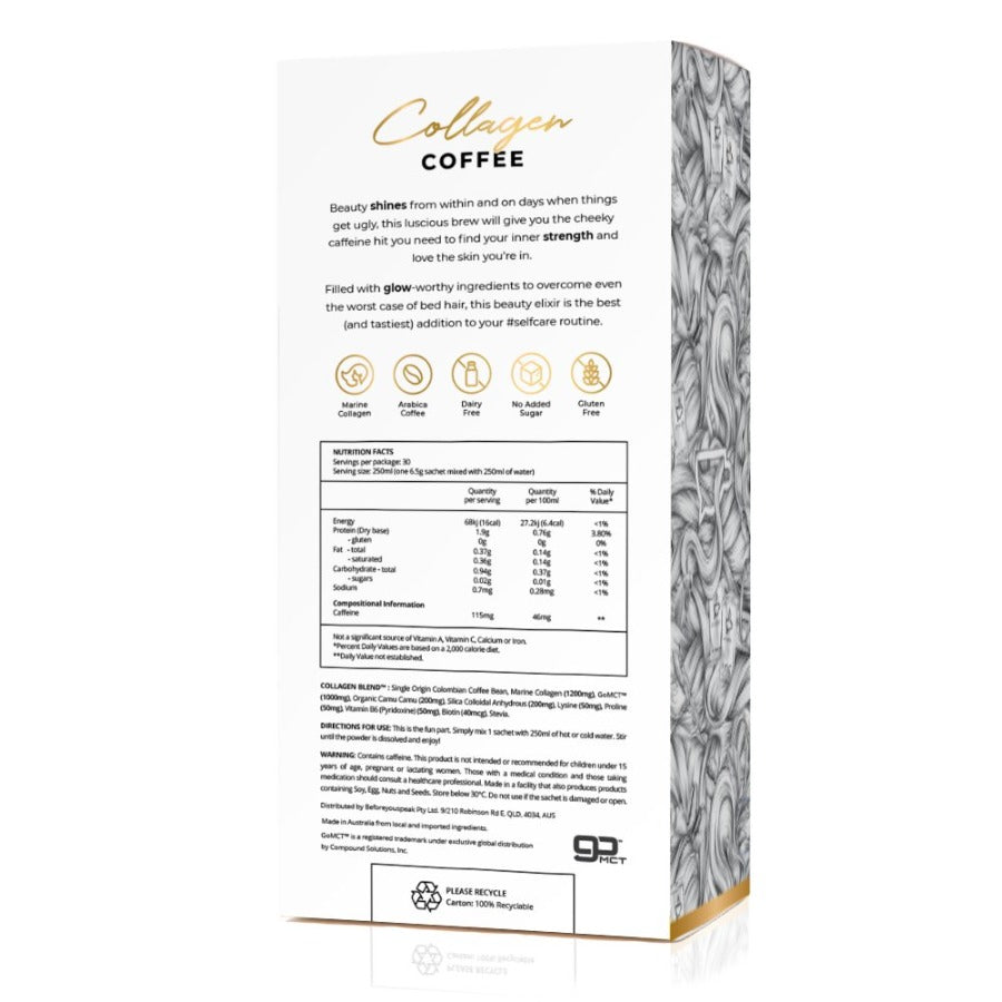 INGREDIENTS: Single Origin Colombian Coffee Bean, Marine Collagen (1200mg),GoMct™ (1000mg), Organic Camu Camu (200mg), Silica Colloidal Anhydrous (200mg), Lysine (50mg), Proline (50mg), Vitamin B6 (Pyridoxine) (50mg), Biotin (40mcg), Cacao (Mocha only), Stevia (Mocha, Original only)