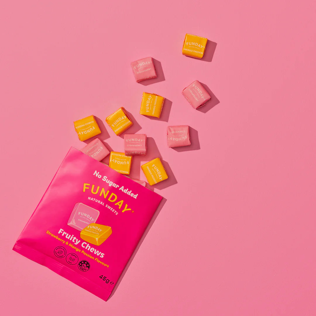 Introducing Fruity Strawberry + Mango Passion Chews – juicy, stretchy, and bursting with bold flavour. These chews bring a refreshing party to your mouth, combining sweet strawberry with tangy mango passion. Fun, fruity, and better-for-you, they’re the kind of lolly that keeps the vibes going all day long.