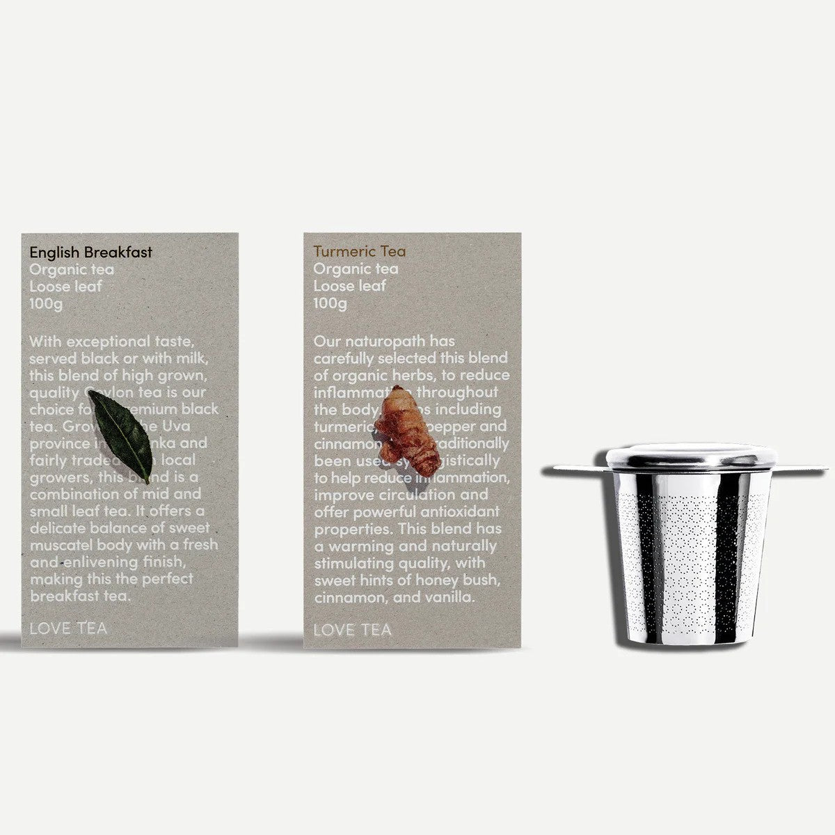 This gift pack contains English Breakfast and Turmeric Tea, two of our most loved blends, paired with a stainless steal infuser.