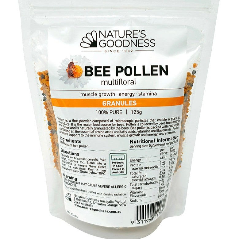 Pollen is a fine powder composed of microscopic particles that enable a plant to reproduce. It is the major food source for bees. Pollen is collected by bees from within the flower and is naturally granulated by the bees. Bee pollen is packed with nutrients, containing all the essential amino acids and fatty acids, vitamins and flavonoids. Pollen provides support to the immune system, muscle growth and energy, and stamina.