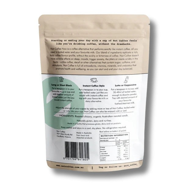 Say goodbye to complex brewing methods and hello to instant satisfaction. Not Coffee Now (Instant) effortlessly delivers a delightful coffee-like experience with just boiled water and your favorite milk or dairy alternative. It's the hassle-free solution for those seeking a quick and easy way to enjoy a satisfying cup of goodness.