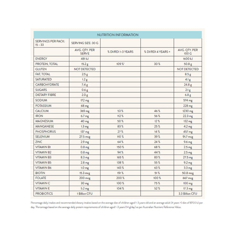 Featuring gut-friendly protein, calcium, iron, selenium, vitamins C, E, folate and other B vitamins to support optimal health and wellbeing.