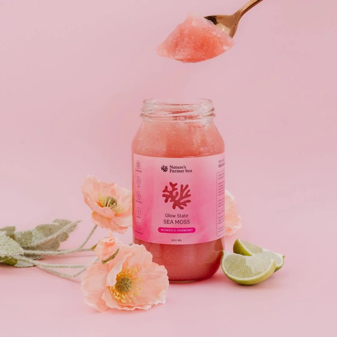Our new Glow State Sea Moss gel particularly supports hormonal balance & feminine wellness, boosts skin & hair health, naturally aids digestion, gut wellness, balances energy levels & supports detoxification. Our Sea Moss is sustainably sourced, and free from artificial additives.